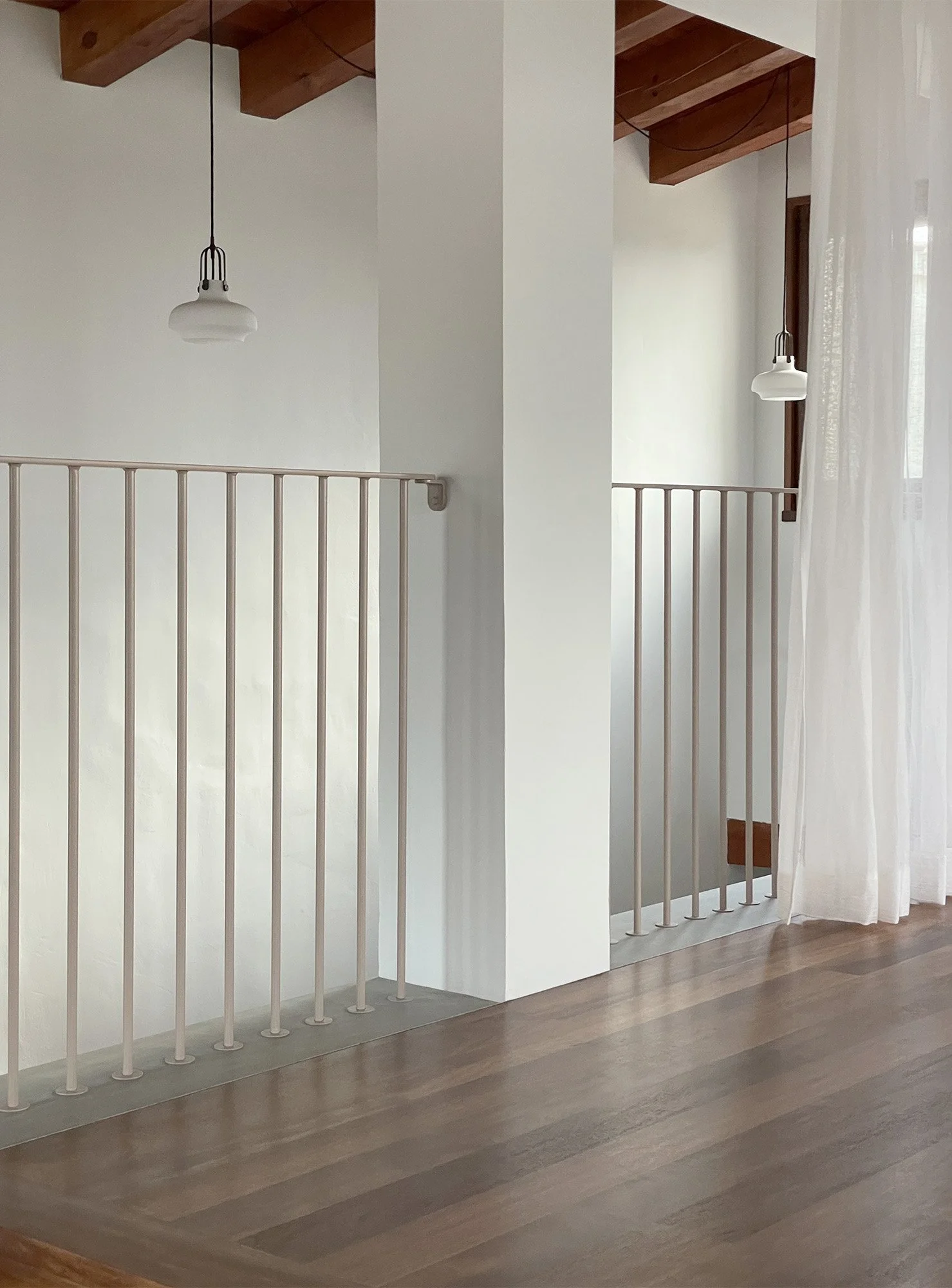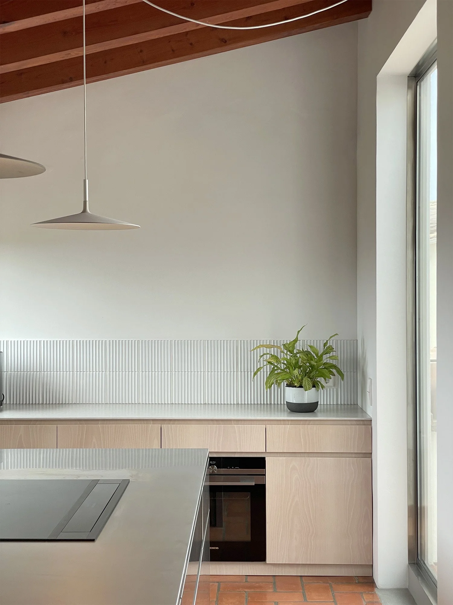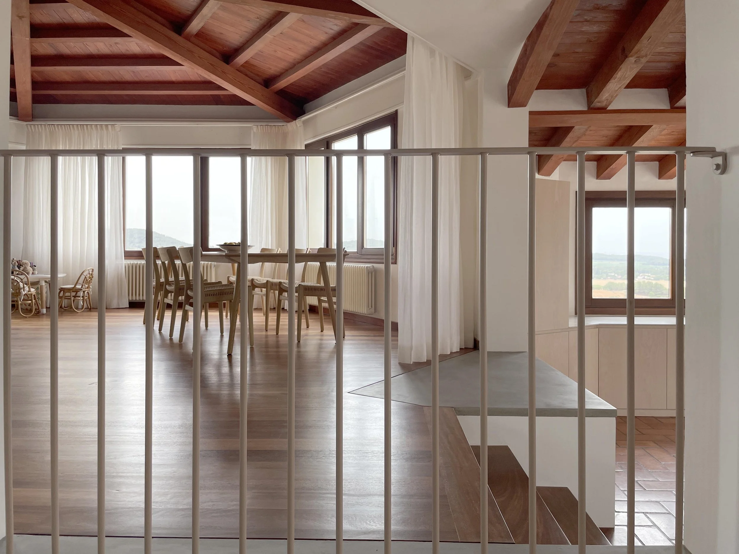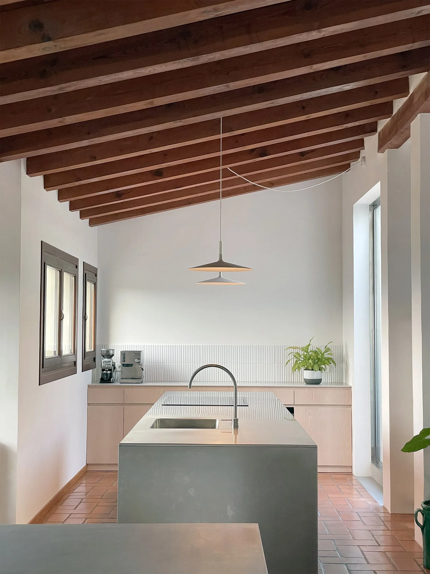 The building’s structure is made of concrete frame with a brick skin.The visible timber beams are supporting both the roof and floors. All exterior existing doors and windows are made of iroko, a durable wood ideal for outdoor.The main materials inside include clay tiled floor, iroko timber floor, iroko doors and plaster walls.The proposed material are neutral in colour, cement has been used to the the floor’s scars, stainless steel to fittings, bespoke kitchen island, proposed doors and windows, the pendant lights above the kitchen islands are also in white concrete.The proposed joineries are made in a white cherry finish, the grain of the timber is kept uninterrupted.
