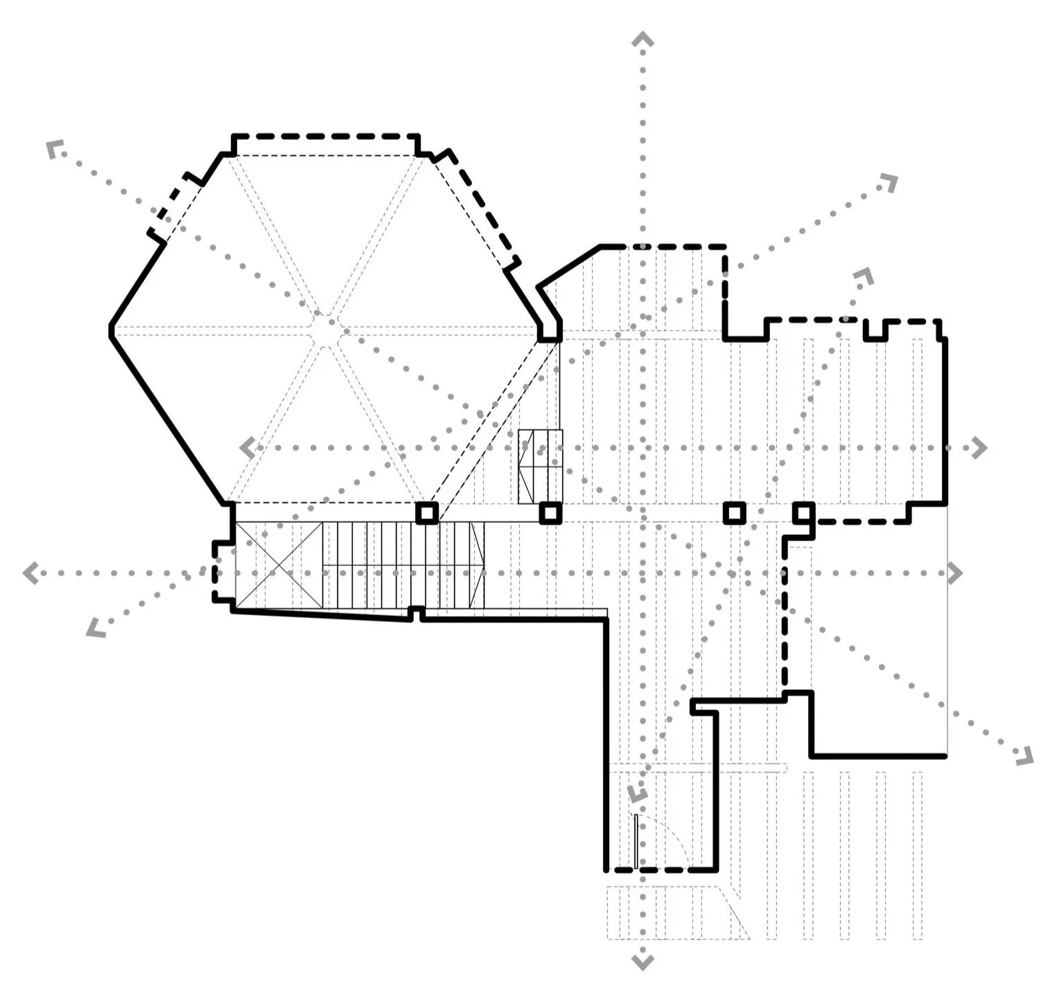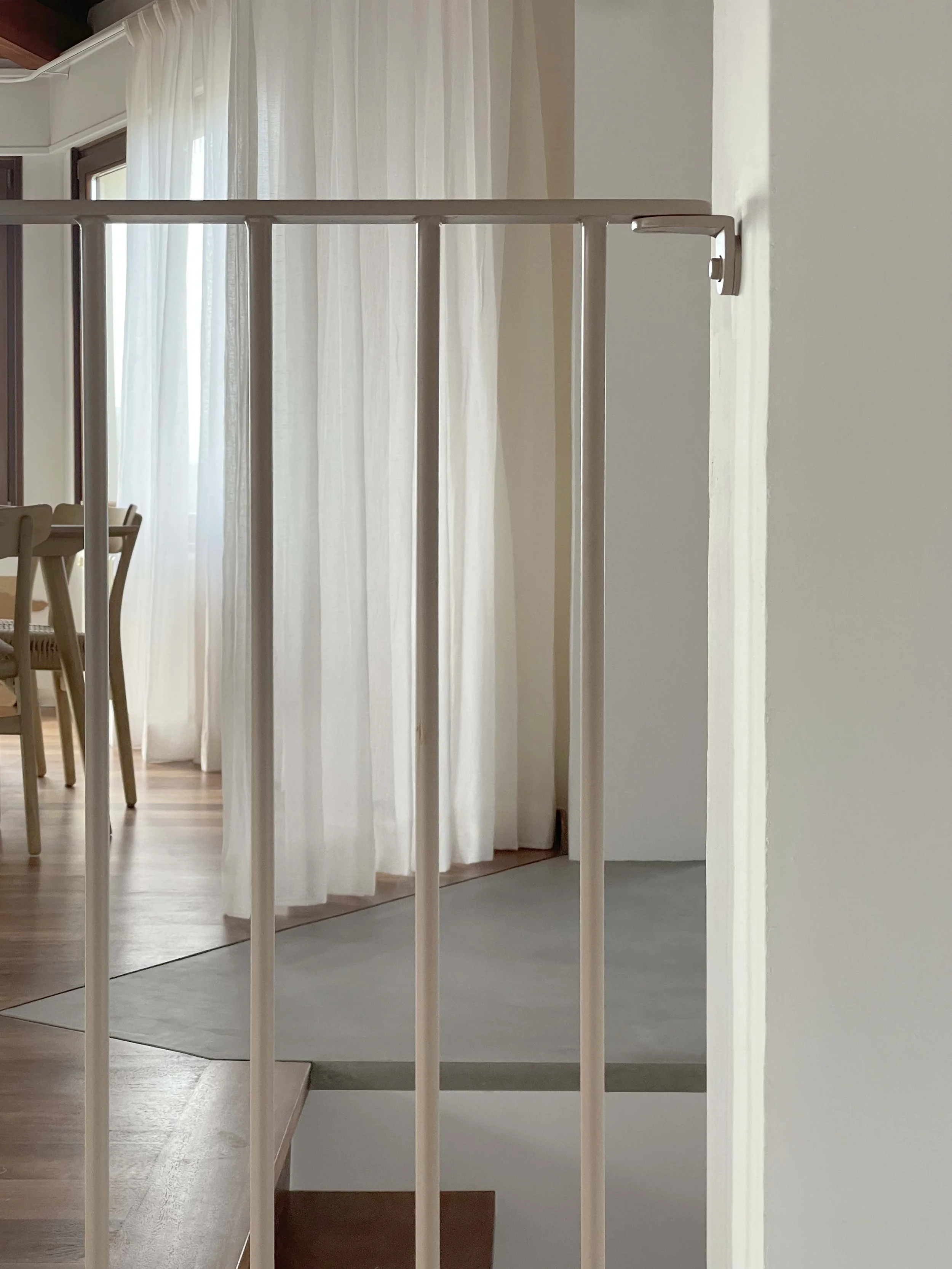 The demolition of the concrete slab above the stairs rediscover a staggered triple height connecting the various levels of the property offering diversity and complexity of the views with some aspects intentionally aimed to the exterior, and other reflecting the interior of the space.The proposed demolitions are revealing the existing pillars supporting the pitched roof’s ridge above, now the building tectonic is establishing the order of the space shifting away from the previous incongrous collection of forms subdividing the floor plan.