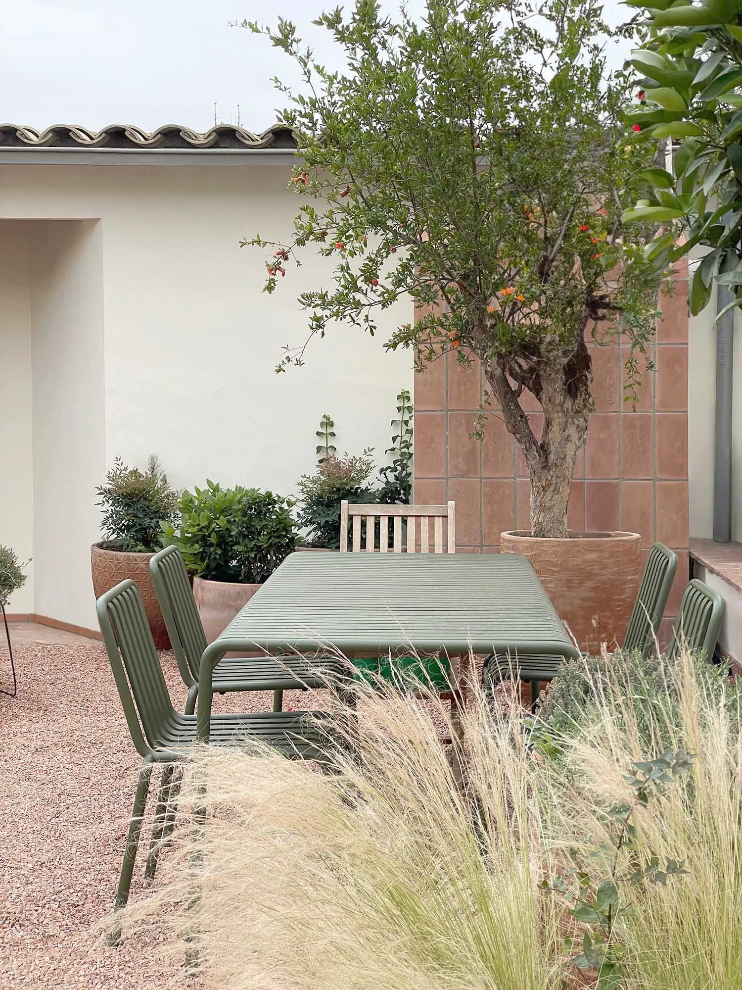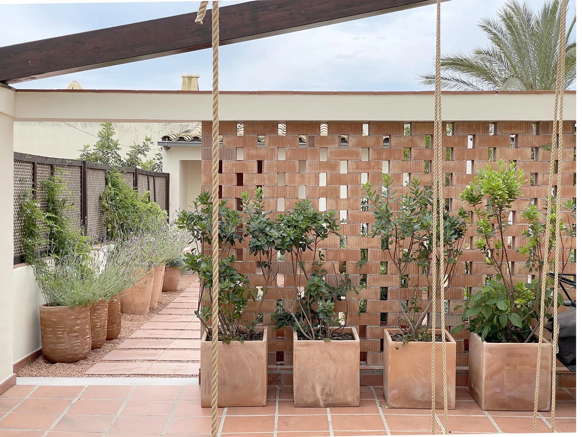 The crushed bricks resulting from the building site demolition have been used as clay gravel for the entrance patio.The patio’s wall lattice is constitute of construction perforated bricks, a humble material that is normally utilised in construction and hidden behind refined finishes, the selected material is instead utilized in a rigorous manner proudly exposing all the defects, rough texture as well as the slight changes in the tone as a testament that there is beauty in imperfection.The material selection is reconciling in an harmonious way proposal and existing, aligning with the character of the surrounding landscape and resulting in a precise response to the different constructive needs yet coherent with the overall design.